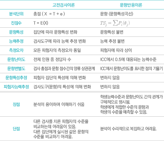 정답률에 의해 평가 문항이 분석되는 고전검사이론의 경우, 시험에 응시한 학생의 시험 결과 자료를 이용하여 문항난이도를 계산하는 방식으로써 동일한 문항이라도 응시생 집단의 능력 수준에 따라 문항의 난이도가 상대적으로 측정되는 한계가 있을 수 있습니다(Robert, 2006).